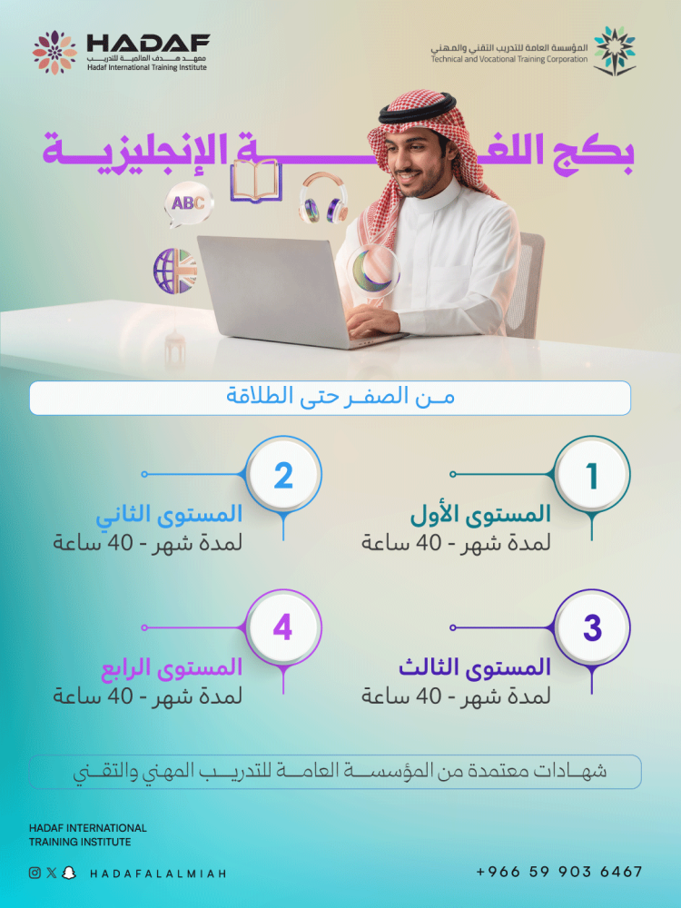 📍 احجزي مقعدك في بكج اللغة الإنجليزية حضوري بالمدينة المنورة وكوني جزءًا من تجربة تدريبية ذهبية ✨ فقط من منصة هدف التعليمية العالمية 💪