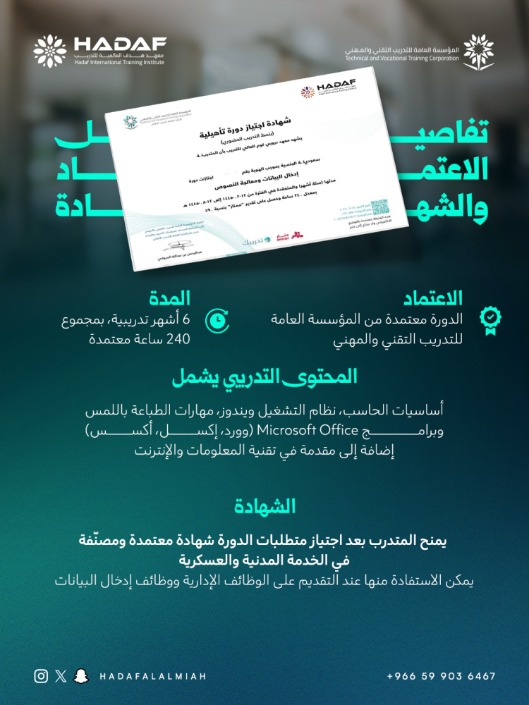 💼 شهادة معتمدة من المؤسسة العامة للتدريب التقني والمهني — ومصنّفة في الخدمة المدنية.